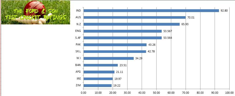 Oct – Dec 2019 – India gain 12.73 against South Africa – lead extends for India, South Africa drops to 5th! New Zealand gain 3.31 points against England. For one series NEW ZEALAND RISE TO 2ND – THEIR HIGHEST EVER POSITION. Australia gain 4.84 points from Pakistan (and go back to 2nd), but then Pakistan reclaim those points and more (5.16) against Sri Lanka to get ahead in the table.  Table is Ind (93),  Aus (70), NZ (66), Eng (53.567), S Africa (53.564), Pak (43), Sri Lanka (43)